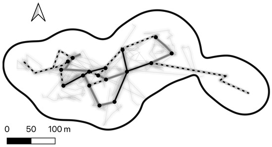 Line density heatmap of the nightly routes for one female Javan slow loris (TE) throughout the study period, within their home range (grey 95% KDE). The overlapping route network is presented in black (routes travelled more than five times), grey (three to four times), and dotted (twice). The black circles are junctions or nodes where multiple routes intersected over multiple days. In grey are all the recorded routes.