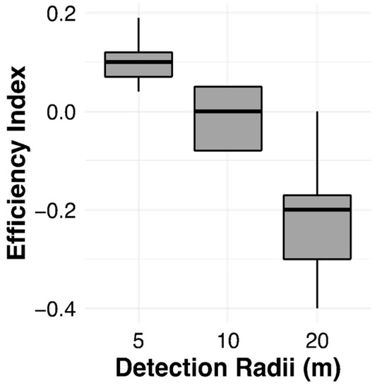 Efficiency indices measured in 13 Javan slow lorises (Nycticebus javanicus) in relation to the detection radii.