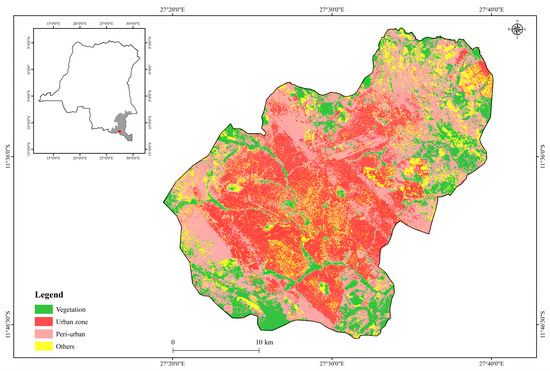 Geographical location of the study area, the city of Lubumbashi (The red dot on the map above) in the Haut-Katanga province, the Democratic Republic of the Congo. The land cover map of the city of Lubumbashi was created from a Landsat image taken in July 2021. The urban zone occupies the central part of the town and is surrounded by an aureole formed by the peri-urban zone. The vegetation in these two zones is very sparse.