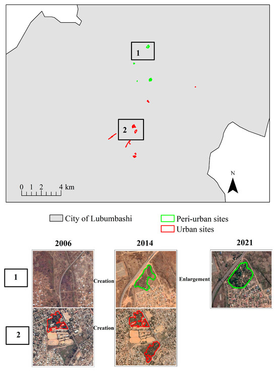 Maps of the evolutionary trends in the area and the number of patches of A. auriculiformis plantations in urban and peri-urban zones of the city of Lubumbashi from the digitization of Google Earth images from 2006, 2014, and 2021, according to Bogaert et al. [47].