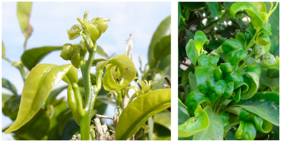 Citrus plants are affected by aphids, which cause direct damage mainly by deformations of young leaves (Figure 1). Indirect damage resulting from virus transmission by aphids is often more impactful than direct damage. Damage depends mostly on the aphid species present in the orchard [4]. For a given aphid species, injury depends on the ecological characteristics of the agricultural system, which, in addition to regional climatic conditions, is very dependent on human activities. The plant (citrus host species and its sprouting pattern), agricultural practices (irrigation, fertilization, and pruning practices) [5], regional and local climatic conditions, and some ecological factors like the activity of aphids’ natural enemies work in an integrated manner, resulting in a certain degree of damage [4]. Under favorable conditions, high aphid density may cause a reduction in fruit production by more than 50%, as previously reported for Aphis gossypii [6].