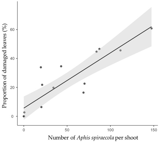 Relationship between the number of Aphis spiraecola per shoot and the proportion (%) of damaged leaves on the same shoot. These observations were carried out in the spring of 2019 on a citrus collection orchard in southern Portugal (Y = 0.3823X + 5.6561, R2 = 0.77, ANOVA: F = 44.07, p < 0.0001). The shaded area represents the standard error of the regression.