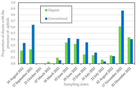 A major factor that influences insect pest damage is the pest management strategy. Interestingly, in the experimental orchard and during 2022 (Table 1, survey 4), there were no significant statistical differences between organic and conventional orchards in relation to the proportion of shoots with aphids (Figure 4). This result substantiates that organic pest control is, at least, equivalent to the control achieved with conventional chemical products and highlights the positive action of natural enemies in organic farming complemented with organically authorized pest control products. The management of an agroecosystem that promotes the development of parasitic and predatory insects and mites may therefore represent an important resource for pest control [35]. However, our results may be affected by the sampling methodology used, which, although not time-consuming, may be insufficient to detect small differences between the two modes of production.