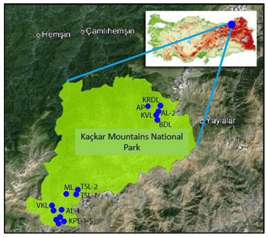 - Kurdoğlu, O. Kaçkar Dağları Milli Parkı ve Yakın Çevresinin Doğal Kaynak Yönetimi Açısından İncelenmesi. Ph.D. Thesis, KTÜ Fen Bilimleri Enstitüsü, Orman Mühendisliği Ana Bilim Dalı, Trabzon, Turkey, 2002. [Google Scholar]
