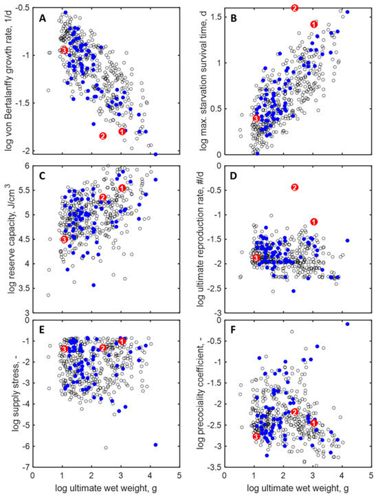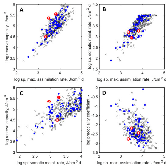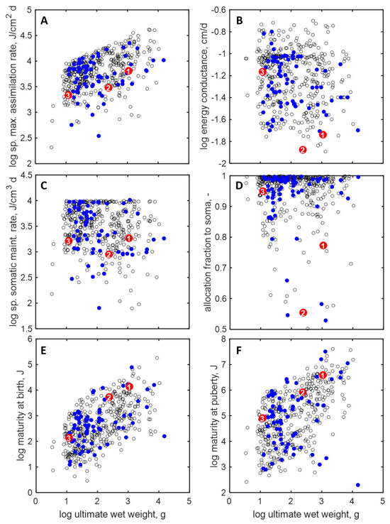 - Kooijman, S.A.L.M.; Lika, K.; Augustine, S.; Marn, N. Multidimensional scaling for animal traits in the context of dynamic energy budget theory. Conserv. Physiol. 2021, 9, coab086. [Google Scholar] [CrossRef]