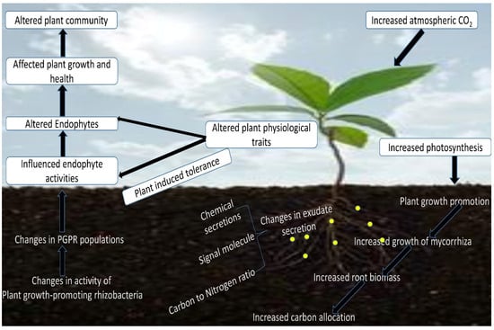 Climate-induced stress also negatively affects the rate of root exudation, with elevated CO2 levels resulting in a high carbon pool in the root environment, thus causing alteration to the root exudate components (Figure 1). Consequently, the ratio of plant signaling chemical attractants and the carbon–nitrogen ratio have been influenced by climate change. Additionally, this has led to changes in the dynamics and activities of microorganisms below ground level. Therefore, evidence from the works of literature by researchers has established the implications of climate change on microbial ecological mutual interactions in the rhizosphere [20,80]. The ability of certain beneficial microorganisms to colonize the soil–root interface under environmentally induced stresses can mediate their functionalities for improving plant nutrition sustainably. The alteration in the environmental conditions can bring a change in the plant physiology and its associated microbial world [81]. The soil microbiome in the soil–root environment can influence the rhizo-compartments in response to the nutrient bio-availability and acquisition, which can, however, facilitate their colonization and penetration into the plant root endosphere, conferring beneficial effects on the host plant to improve yield [82,83].