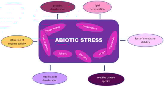 In recent times, the need to address natural or induced abiotic stressors that threatened plant growth and crop productivity became important by finding a possible solution to avert their negative impact on the ecosystem [22]. The negative influence of nonliving components beyond normal that alters the composition and performance of living components in econiches can be responsible for abiotic stress induction. The various abiotic stressors may exert different effects on the ecosystem, such that plants may tend to develop resistance depending on the stress conditions [29]. Hence, the adequate management of abiotic-induced stresses can be the key to maintaining plant and soil health sustainably. The diverse mechanisms of plant responses to certain environmental conditions may be linked to the expression of certain genes involved in biochemical, physiological, cellular, and molecular modifications [104]. Abiotic stress factors display identical effects on plants, which include the deterioration of plant cellular and molecular components, the loss of membrane stability, nucleic acids, proteins, and lipid denaturation, production of ROS, and the alteration of enzyme activity by reducing crop yield and productivity [105].