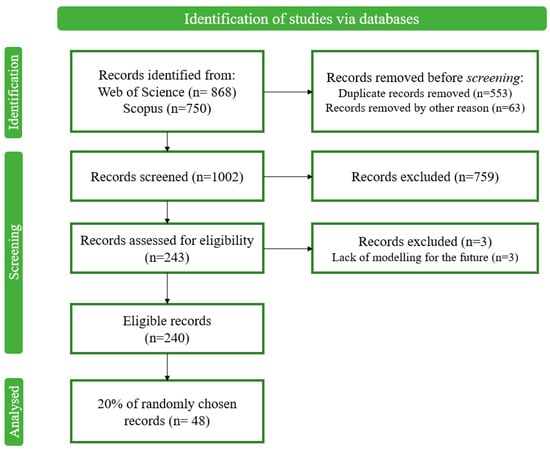 This study aims to identify if best practices are followed when assessing changes in plant species distribution under climate change scenarios based on niche modeling in recent papers. The article search was conducted in November 2022 in two databases (DBs): Web of Science (WOS) and Scopus. These DBs may have some overlapping results but are considered the two most comprehensive sources of bibliographic resources [81,82]. The following search equation was included, using Boolean search strategies: (“climate change” OR “global change”) AND (“model*” OR “ecological niche model*” OR “species distribution model*” OR “habitat suitability model*” OR “range shift”) AND (“R software” OR “maxent” OR “Biomod*” OR “GLM” OR “average model*” OR “ensemble*”) AND (“flora” OR “plant*”). The search was carried out for the item “Topic” in the WOS Core Collection and the “Article title, Abstract, Keywords” topics in Scopus. Since modeling methodologies are constantly changing, a time limit was imposed on the research, considering only scientific papers published from 2018 to 2022. Only original articles were considered, and other document types, such as review articles, books, and book chapters, were removed. The search was based on PRISMA guidelines [82,83], and the flow chart (Figure 1) shows the different steps undertaken in the current study.