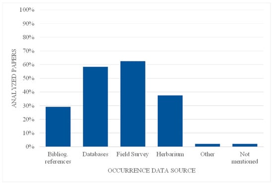 The studies use different data sources for the species occurrence data, and only in one case was this information missing. The use of one or two combined sources was the most common situation (35.4%), but the combination of three (18.8%) or four (8.3%) data sources was also identified. The most used data source was a field survey (62.5%), followed by the use of online databases, such as the Global Biodiversity Information Facility (GBIF) (58.3%) (Figure 2).