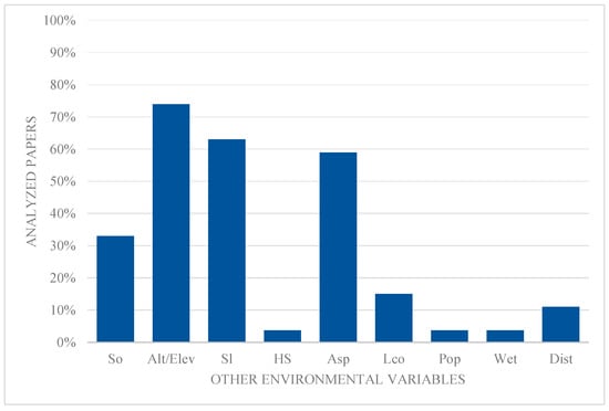 Percentage of papers using other environmental variables: soil (So), altitude/elevation (Alt/Elev), slope (Sl), hillshade (HS), aspect (Asp), land cover (Lco), human populations (Pop), distance to wetland (Wet), and distance to (…) (Dist).