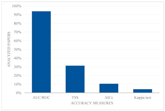 The model’s predictive performance was evaluated using four different accuracy measures: the Area Under the Curve of the Receiver Operating Characteristic/(AUC of ROC), Akaike’s Information Criterion (AICc), the True Skill Statistic (TSS) test, and Cohen’s Kappa coefficient. The most used method was the AUC of ROC, mentioned in 93.8% of the articles, the TSS was used in 31.3%, the AICc in 10.4%, and Cohen’s kappa coefficient in 4.2% (Figure 4).