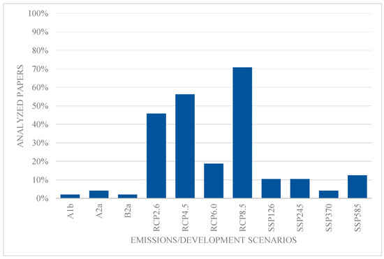 The analyzed papers mainly used two (59.6%) or four different climatic scenarios (19.1%). The use of one or three different scenarios was less common and occurred in 8.5% and 12.8% of the cases, respectively. The most popular scenarios were the Representative Concentration Pathways (RCPs): the RCP8.5 (70.8% of the documents), the RCP4.5 (56.3%), and RCP2.6 (45.8%) (Figure 5).