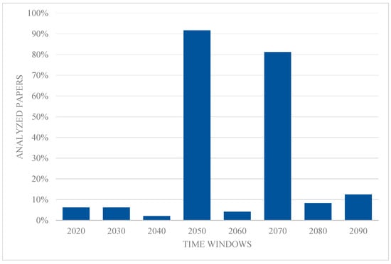 Some future time windows are more popular among SDM papers, namely 2050 (average for 2041–2060) and 2070 (average for 2061–2080), which appear in 91.7% and 81.2% of the documents, respectively (Figure 6). Papers used from one to five different time intervals, with 75% using two different time intervals, 12.5% using only one, and 12.5% using 3 to 5.