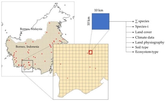 This study utilizes both primary and secondary data. The primary data consist of survey results on mammal species presence and ecosystem types conducted between 2011 and 2021 at 78 locations in Borneo, Indonesia (Tables S1–S3). The secondary data include maps, tabular data, and results from previous biodiversity surveys and studies (Table 1). These data and information are organized into a geodatabase, ensuring each dataset has georeferenced values. The geodatabase is structured into a data grid with a spatial resolution of 10 × 10 km (10,000 ha). Each grid cell has unique attributes: species presence, land cover, ecosystem type, species distribution, and biophysical conditions (Figure 1). The tools used to develop the geodatabase include MSQL and ArcGIS 10.1. These attributes are grouped using cluster analysis with the k-means algorithm. This analysis was conducted using Minitab version 20. The programming language used to develop the model application is Visual Studio 2019, while statistical analyses were performed using Minitab version 20.