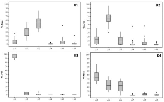 Diversity of land cover in each cluster (K1, K2, K3, K4) (note: LU1: forest, LU2: shrub, LU3: plantation and industrial plantation, LU4: agricultural land, LU5: settlement, LU6: water body). *: The size limit uses a body weight of less than 5 kg/ind for small mammals and vice versa for large mammals.