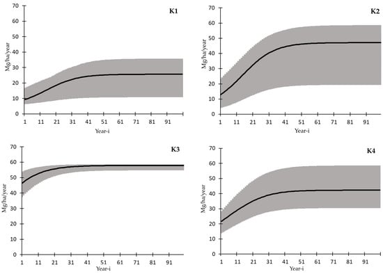 The validation results indicate that the trophic level model can evaluate the role of each characteristic variable of mammal species in the ecosystem. Differences influence biomass transformation at the producer level in input diversity of land cover, which is divided into four clusters (K1, K2, K3, and K4). Vegetation (producer) biomass growth reaches a maximum limit after the n-year. The rate of biomass addition tends to decrease, and biomass provision for the first consumer becomes constant (Figure 4). Theoretically, vegetation will reach a climax growth level after several years [59,60,61]. After its climax phase, the biomass produced from photosynthesis is only used for maintenance respiration; thus, growth tends to approach zero [62]. The initial land cover condition will determine the growth rate and the amount of producer biomass in the first year. The shrubland composition in K2 and K4 leads to a higher biomass growth rate than K1 and K2.