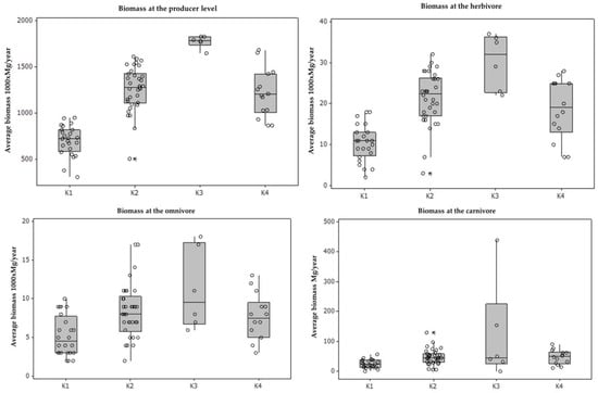 Distribution of biomass allocation at each trophic level at each location in clusters K1, K2, K3, and K4. * is the symbol for outlier data.