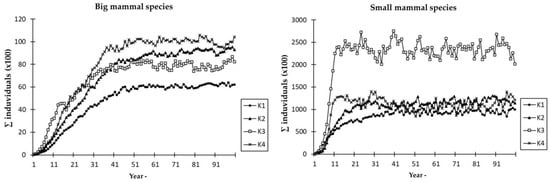 The average development of the number of big mammals (right) and small mammals (left) in each cluster (K1, K2, K3, and K4).