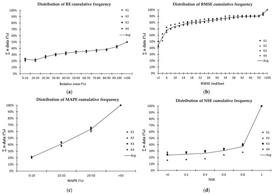 The relative frequency distribution of each validation value of the results of the models K1, K2, K3, and K4: (a) KR, (b) RMSE, (c) MAPE, and (d) NSE.