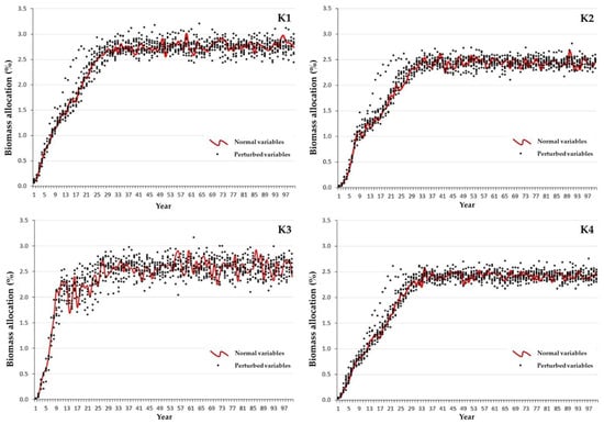 Changes in ecosystem biomass allocation to mammals due to the perturbation of mammal species characteristic variables in the model in each ecosystem (K1: plantations and industrial forest plantation, K2: shrubs, K3: forests, and K4: mixed).