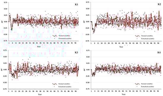 Changes in the Shannon–Wiener diversity index (H′) with normal variables vs. perturbations of mammalian characteristic variables (K1: plantations and industrial forest plantation, K2: shrubs, K3: forests, and K4: mixed).