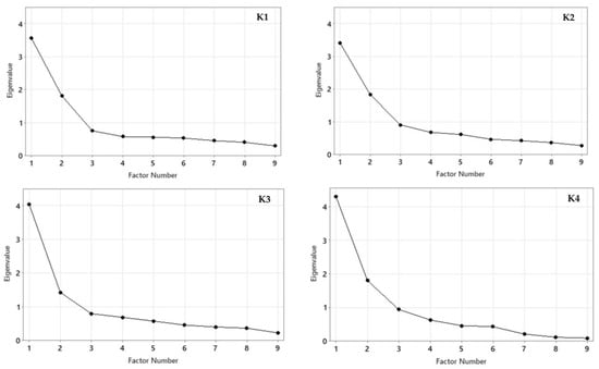 A correlation matrix between all variables is required to assess multicollinearity of the data, and data reliability is tested with a limit of Cronbach’s α value ≥ 0.7 [50,51]. The number of selected factors is determined using the criteria of eigenvalues ≥ 1. Factor extraction is performed using the principal component analysis (PCA) method with varimax rotation so that the factor structure can be interpreted more clearly. The interpreted factor values include factor loadings and communalities for each variable. Additionally, scree plots further confirmed the retention of factors as being salient, supporting our selection criteria.