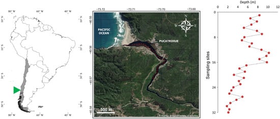 Location of the Contaco Estuary on the southeastern Pacific coast of Chile. The left panel highlights the position of the estuary in Chile (green triangle) within South America. The central panel shows a high-resolution satellite view of the estuary, sampling sites and its surrounding area, including the rural village of Pucatrihue. The right panel shows depth variation across sampling sites in the Contaco Estuary. The y-axis represents the sampling sites ordered sequentially from the estuary mouth (site 1) to the head (site 32), while the x-axis indicates water depth (m) at each site. Red dots represent measured depth values, and the dashed line connects sequential sites to illustrate depth fluctuations along the estuarine gradient. Map data © OpenStreetMap contributors and MapTiler.