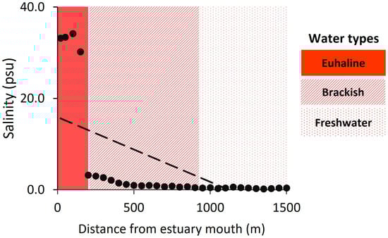 Salinity recorded along the Contaco Estuary. As expected, salinity values (black dots) decrease significantly from the mouth to the head of the estuary (black dashed line, r2 = 0.382, p < 0.0001). Three water types were identified in the Contaco Estuary based on salinity levels: euhaline (30–40 psu), brackish (0.5–29 psu), and freshwater (<0.5 psu).