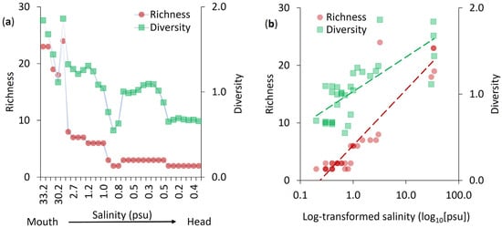 Species richness (number of species) and diversity (Shannon–Wiener diversity index) along the Contaco Estuary salinity gradient. (a) Species richness ranged from 24 to 2 species, while diversity ranged from 1.8 to 0.6. Both metrics showed a monotonic decrease from the estuary mouth to its head along with the observed salinity gradient. (b) Richness and diversity exhibited strong positive correlations with salinity: richness (r2 = 0.823, p < 0.0001) and diversity (r2 = 0.553, p < 0.0001). Panel (a) displays actual salinity values measured at ~50 m intervals along the estuary from mouth to head, while panel (b) illustrates the relationship between diversity metrics and log-transformed salinity values. These results highlight the influence of salinity on community composition and diversity patterns in the estuary.