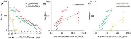 When plotted against log-transformed salinity, total abundance exhibited a positive and significant correlation (r2 = 0.647, p < 0.001; Figure 4b). Similarly, the abundance of calcareous and agglutinated species was strongly correlated with log-transformed salinity (r2 = 0.934, p < 0.0001, and r2 = 0.709, p < 0.0001, respectively; Figure 4c). The distribution of calcareous species was steeply associated with higher salinity values (log10[psu] > 1), reflecting their dependence on euhaline conditions, whereas agglutinated species were more evenly distributed across the salinity gradient, with a broader tolerance range.