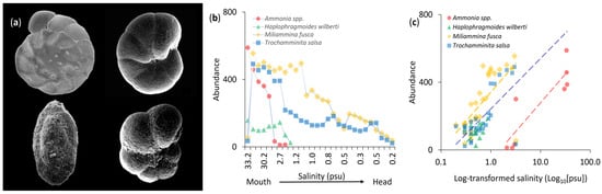 Relationships between the abundance of dominant foraminiferal species and salinity across the Contaco Estuary. (a) Scanning electron microscopy (SEM) images of the four dominant taxa, which account for 87% of the total abundance in the Contaco Estuary. Top row, from left to right: Ammonia spp. (calcareous) and Haplophragmoides wilberti (agglutinated). Bottom row, from left to right: Miliammina fusca (agglutinated) and Trochamminita salsa (agglutinated). (b) Longitudinal abundance patterns of the four dominant species along the observed salinity gradient, ranging from the estuary mouth (euhaline waters) to its head (freshwater). Each species shows a clear decrease in abundance upstream as salinity declines. Salinity values (psu) are plotted in their natural sequence, from highest to lowest, reflecting their actual longitudinal distribution along the estuarine gradient. The data highlight distinct salinity tolerance levels among taxa. (c) Abundance of the four dominant taxa as a function of log-transformed salinity (log10[psu]), with dashed lines representing regression fits for each taxon (Ammonia spp., r2 = 0.779, p < 0.0001; M. fusca, r2 = 0.439, p < 0.0001; H. wilberti, r2 = 0.234, p < 0.0001; T. salsa, r2 = 0.472, p < 0.0001).