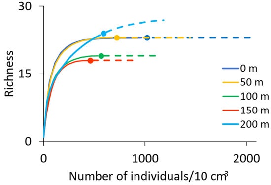 Rarefaction and extrapolation curves estimated using abundance data of foraminifera from the Contaco Estuary. To facilitate visualization, only the curves for the first five sampling sites (0, 50, 100, 150, and 200 m from the estuary mouth) are shown. Full rarefaction and extrapolation curves, including confidence intervals for all 32 sites, are available in Figure S1. Solid lines represent rarefaction, while dashed lines indicate extrapolation. Circles along the curves denote the observed species richness based on the total number of individuals collected at each site. The x-axis reflects the number of individuals per 10 cm3, and the y-axis indicates species richness. These results demonstrate effective sampling coverage, with most sites approaching an asymptote in species richness before extrapolation.