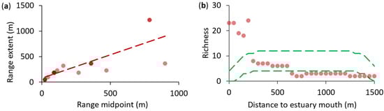 (a) Rapoport’s rule: a significant positive relationship between range extent and range midpoint for the 31 species recorded (r2 = 0.645, p < 0.0001) supports the existence of Rapoport’s longitudinal rule in the Contaco Estuary. The number of visible data points is smaller than the actual number due to overlapping values, i.e., darker red points represent higher overlap density. (b) Mid-domain effect: observed species richness (red circles) as a function of distance from the estuary mouth compared to the richness predicted by the upper and lower 95% confidence intervals of the mid-domain effect null model (green dashed lines). The empirical richness pattern diverged from the hump-shaped richness pattern predicted by the null model.