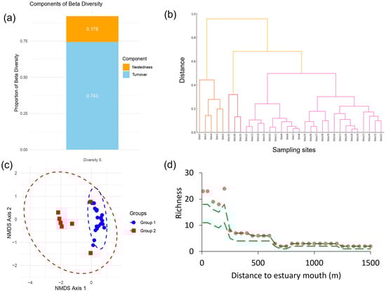 Both richness and diversity were positively correlated with salinity, further underscoring the influence of the estuarine gradient on community structure. Richness displayed a strong positive correlation with salinity (r2 = 0.823, p < 0.0001), while diversity followed a similar trend (r2 = 0.553, p < 0.0001) (Figure 3b).