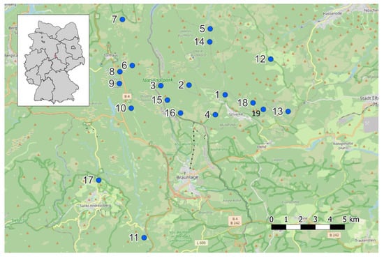 - Frank, D.; Schnitter, P. Pflanzen und Tiere in Sachsen-Anhalt. Ein Kompendium der Biodiversität; Landesamt für Umweltschutz Sachsen-Anhalt, Natur + Text: Rangsdorf, Germany, 2016. [Google Scholar]