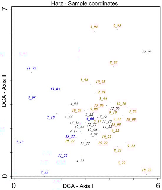 - Hill, M.O.; Gauch, H.G., Jr. Detrended correspondence analysis: An improved ordination technique. Vegetatio 1980, 42, 47–58. [Google Scholar] [CrossRef]