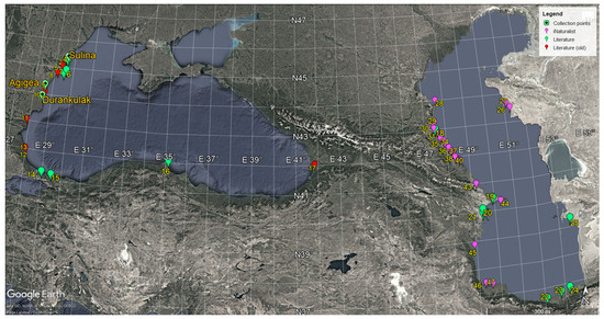 Currently, the literature reported this species in the Caspian Sea coast; in the coast zone of Azerbaijan (32); in Iran, in sites such as Rostam Rood Nour, Goharbaran Sari, and Naftchal Babolsar from the Mazandaran region [2,23,24]; and in the Republic of Dagestan, on the western coast, in Makhachkala [25].