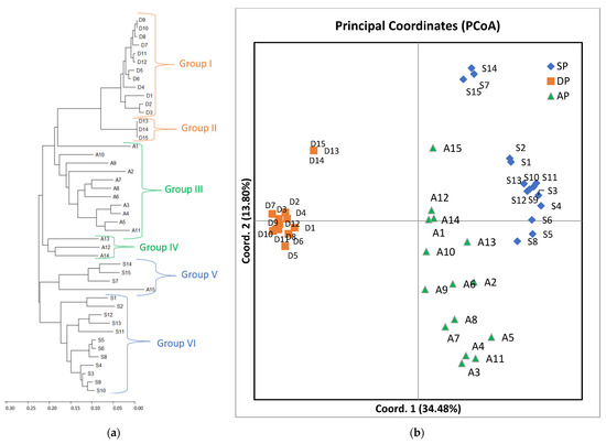 A pairwise genetic distance matrix generated using ISSR binary data was used for the Neighbor-joining dendrogram construction. The Neighbor-joining clustering algorithm generated using the MEGA software grouped 45 genotypes into six clusters (Figure 2a). Three main clusters comprised the majority of samples from each population, while three samples from each population were separated by the population’s main clusters. Thus, DP comprised two clusters: group I, which included the majority of samples (D1–D12), and group II (D13–D15). AP displayed another two clusters: the main group III (A1–A11) and group IV (A12–A14), while the A15 individual clustered with the three different individuals, S7, S14, and S15 from SP, forming the group V. The last group VI included the rest of the samples from SP (S1–S6, S8–S13). The genetic distance between the groups from the same population was small in DP and AP, at 0.158 between groups I and II, and 0.177 between groups III and IV. A low genetic distance was also calculated between AP and SP (groups III and VI). The highest genetic distance was determined between SP and DP, which varied from 0.527 to 0.568 between the groups of these populations.