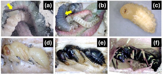 Different stages of P. fulvipes in the nest. (a) One egg (yellow arrow) per cell is laid by the female P. fulvipes with provisioned lepidopteran larvae in the cell; (b) a hatched larva (yellow arrow) consumes provisioned prey; (c) a fully grown larva in the overwintering stage; (d,e) the larva becomes a pupa in the spring; (f) the adult P. fulvipes emerges.