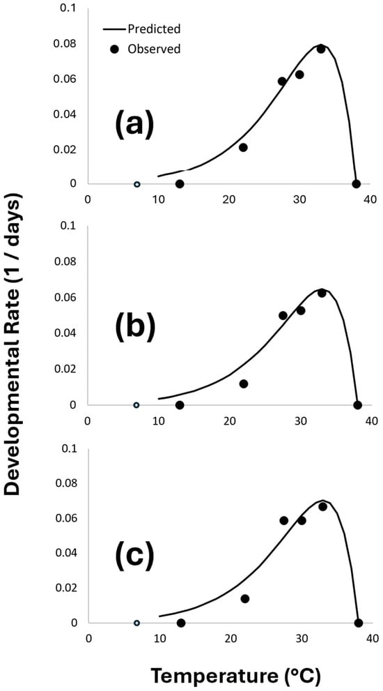 To understand the effect of the temperature on the growth, survival, and reproduction of poikilothermic organisms such as insects, temperature-dependent development models have been used as a crucial tool across taxa and environmental conditions. These models describe the relationship between the temperature and insect development rate []. Insects can develop between two temperature thresholds: the upper developmental threshold (UDT) and lower developmental threshold (LDT). Development between the UDT and LDT typically shows a skewed, unimodal nonlinear pattern. The temperature at which the insect develops at the fastest rate is called TOpt [,], and the temperature between TOpt and the LDT is known as the thermal window []. Using these parameters, the thermal ecology of insects (i.e., development, spring emergence, and phenology) can be described as their adaptation to seasonal temperature regimes [,]. Both linear and nonlinear models are generally used to determine temperature-dependent development; linear models are used to determine the LDT from mid-range temperatures, while nonlinear models provide more accurate descriptions across a wide temperature range [,]. Nonlinear models can also be used to estimate operative temperature ranges, the UDT, and TOpt [].