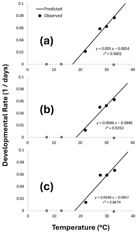 Linear regression of temperature-dependent development of P. fulvipes: (a) males, (b) females, and (c) both genders combined. Only the linear portion of the data was used for regression analyses, and open circles indicate that no adult emerged and thus the data points were excluded from the regression analysis.