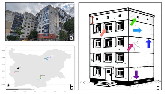 Research sites: (a), an example of a “soviet style” panel building; (b), map of Bulgaria with the six municipalities—Razgrad (pink), Popovo (blue), Dimitrovgrad (light green), Haskovo (dark green), and Bobov dol (orange); (c), schematic representation of the characteristics of the buildings, mentioned in the text: red arrow—the section above the last floor and the roof—the “air bag” with its apertures, indicated by green arrow; tan arrow—balcony and façades; pale blue arrow—vertical joints; dark blue—horizontal joints between panels; purple—basements; magenta—chipped plaster.