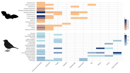 We detected bat colonies in 21 (34.4%) of the 61 buildings. The colonies belonged to the species serotine bat (Eptesicus serotinus (Schreber, 1774)), Savi’s pipistrelle (Hypsugo savii Bonaparte, 1837), lesser mouse-eared bat (Myotis blythii Tomes, 1857), common pipistrelle (Pipistrellus pipistrellus (Schreber, 1774)), Kuhl’s pipistrelle (Pipistrellus kuhlii Kuhl, 1817), soprano pipistrelle (Pipistrellus pygmaeus (Leach, 1825)), noctule (Nyctalus noctula), and grey long-eared bat (Plecotus austriacus). In total, we recorded 10 species and three acoustic groups of bats (Figure 2). The most frequently detected bat was the common pipistrelle (Pipistrellus pipistrellus), acoustically recorded in all 61 locations (Supplementary Materials Supplement S1). Other broadly distributed bats included the Pipistrellus kuhlii/nathusii acoustic group, recorded at 56 locations, and the noctule, recorded at 34 locations. We observed bats in vertical joints (n = 16), under chipped plaster (n = 7), on the façade of the building (n = 5), and in horizontal joints (n = 2), with one recorded in a basement and one in an attic. No bats were observed in the air bag space of panel buildings.