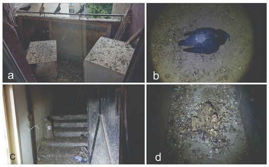 Building’s infestation with feral pigeons: (a), nesting pigeons and guano on a balcony; (b), fresh carcass of a pigeon found in the under-roof space; (c), guano accumulations in the under-roof space; (d), reduced carcases of a pigeon in the under-roof space.