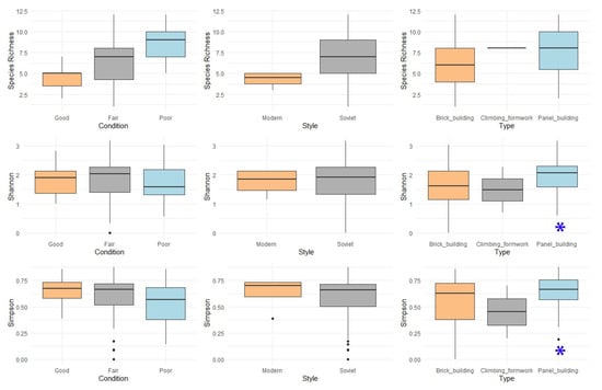Figure representing the relation between diversity indices and different building characteristics. The statistically significant values are highlighted with an asterisk.
