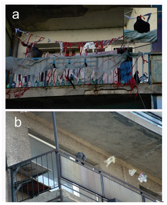 Informal interviews with residents of the inspected buildings revealed that the most disturbing ecological issue was the presence of pigeons. As shown in Figure 5, residents attempted various frightening devices to deter pigeons, but all methods failed. Pigeons were observed perching on these devices and even engaging in courtship behaviour. Pigeons are known for complex behaviour according to Delius 1985 [35] “…With a nervous system containing some 1012 synapses, pigeons seem to possess sufficient information processing power for quite sophisticated cognitive operations”.