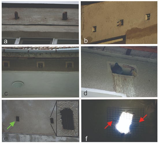 Blocking of the under-roof space apertures: (a), whole bricks cemented in the apertures; (b), plastic bottles full with water stacked in the apertures; (c), part of bricks blocking the apertures; (c), and (d) a pigeon had removed a brick part from the aperture and used the under-roof space for breeding; (e), aperture blocked by nets from outside (green arrow); (f), nets blockade of an aperture from the inside—red arrows indicate the mounting elements.