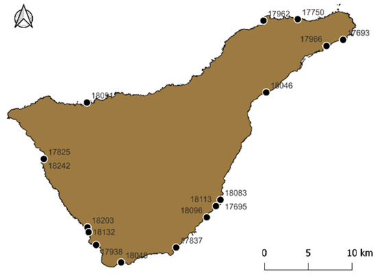 The 23 individuals admitted to the WRC “La Tahonilla” [40] were C. caretta stranded on the island of Tenerife (Figure 4) due to six different causes: indeterminate, weakness-exhaustion, plastic, hyperaesthesia and papilloma, fishing tackle and others. In addition, seven specific sub-causes were recorded: pneumonia, entanglement, disease, nylon, hook, buoyancy problems, and very active sea turtles without visible injuries. Among these, entanglement was the most frequent sub-cause, accounting for 63% of the cases and, specifically, 67% were also attributed to interaction with plastic (entanglement and feeding), specifically plastics such raffia, 22% to undetermined causes (cases in which signs of entanglement were observed but not the material that caused it), with the lowest number of entanglements, 11%, caused by fishing gear (Figure A1).