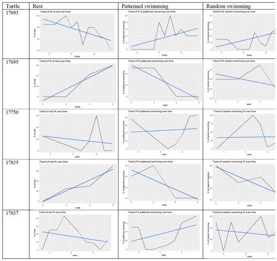 The five turtles studied in greater depth (17693, 17695, 17750, 17825, and 17837) show an evolution of the percentages of time spent at rest, time spent in random swimming, and time spent in patterned swimming for the turtles on which a more detailed study was carried out. For turtles 17693 (p-value = 0.0125) and 17825 (p-value = 0.0421), the time spent randomly swimming varied as the time spent in rehabilitation advanced (Figure 5).