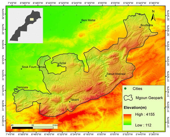 The UNESCO Global Geopark of M’Goun (Figure 1) constitutes the majority of the massifs of the Central High Atlas in Morocco located in the center of Morocco. The highest point is Ighil M’Goun (4068 m) [32], the area of the Geopark shown in Figure 1, recognized by UNESCO in 2014, is 5700 km2. It encompasses 15 rural communes, housing 200,000 inhabitants [19]. The study area elevation oscillates between 544 m and 3708 m, while the mean elevation of the site is 1588 m.